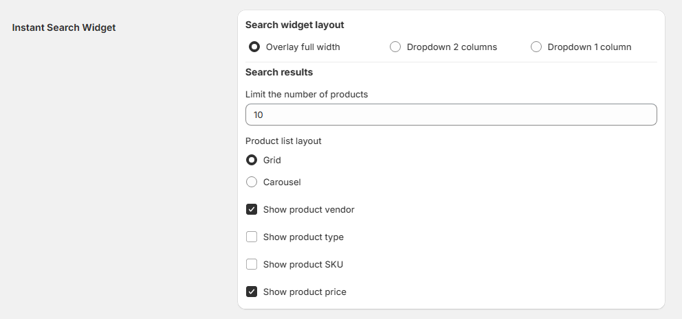 The Instant Search Widget section allows you to customize the appearance and behavior of the live search dropdown that appears when customers type in the search bar.