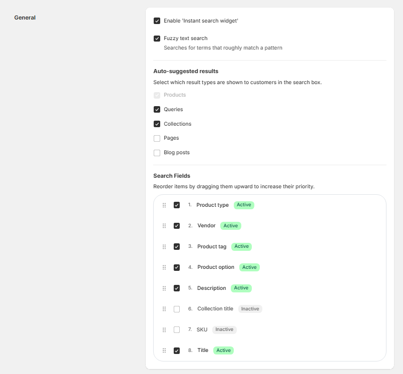 La sección Campos de búsqueda determina qué campos de datos de producto se incluyen en la coincidencia de búsqueda y su orden de prioridad.