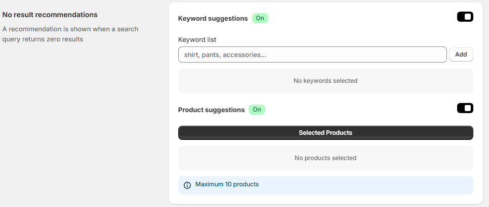 The Zero-Character Recommendations section allows you to define what content is displayed when a customer clicks on the search bar without typing any characters.