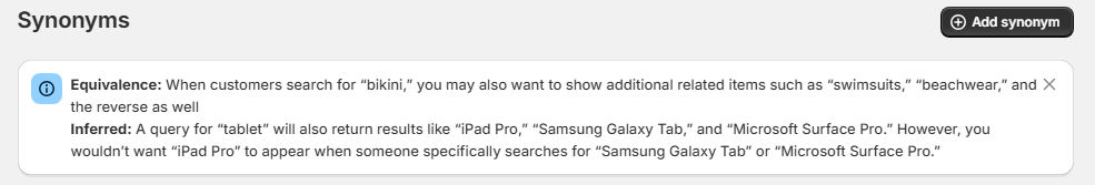 Customers may use different words than those used in your product titles, tags, or descriptions. Synonyms help bridge that gap.