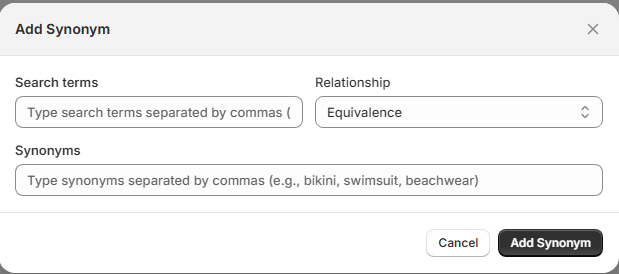 The Add Synonym modal allows you to create a new synonym group to improve search relevance and result accuracy.